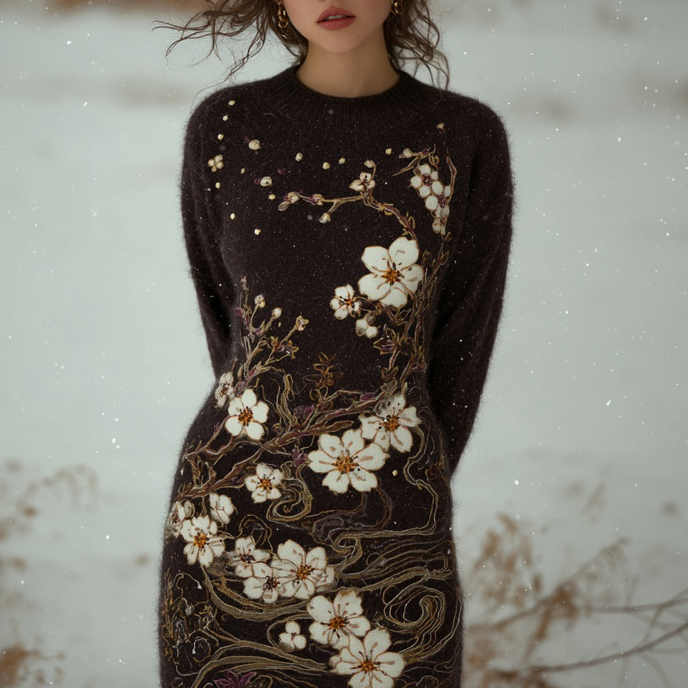 Vintage Japanese Cherry Blossom Art Cozy Knit Sweater Dress