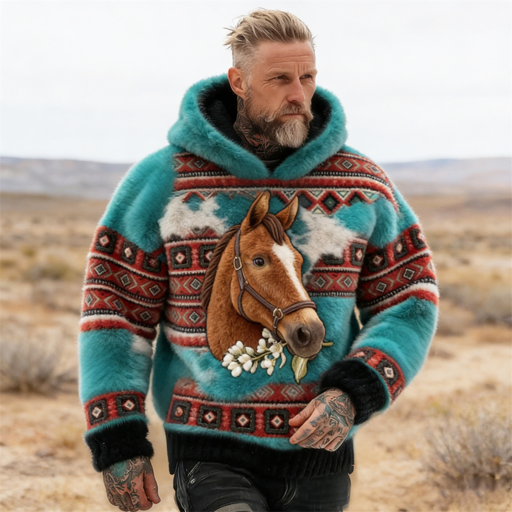 Western Animal Horse & Ethnic Print Men's Chunky Plush Hooded Sweater