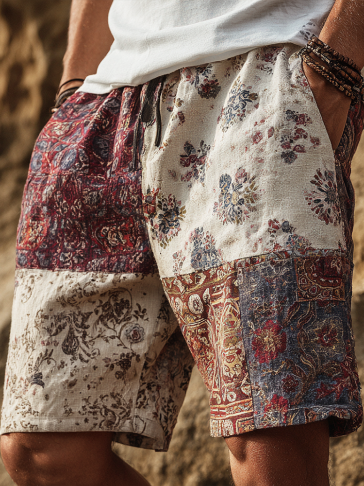 Western Bohemian Style Plant And Flower Pattern Retro Cotton And Linen Loose Wide-leg Shorts