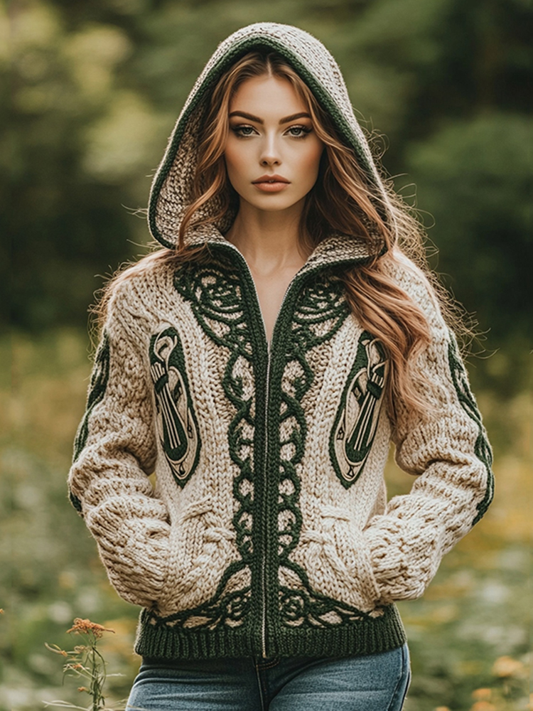 Women's Celtic Knot Harp Jacquard Hooded Zip Sweater
