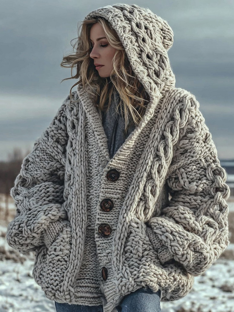 Women's Fair Isle Chunky Knit Warm Button-down Hooded Cardigan