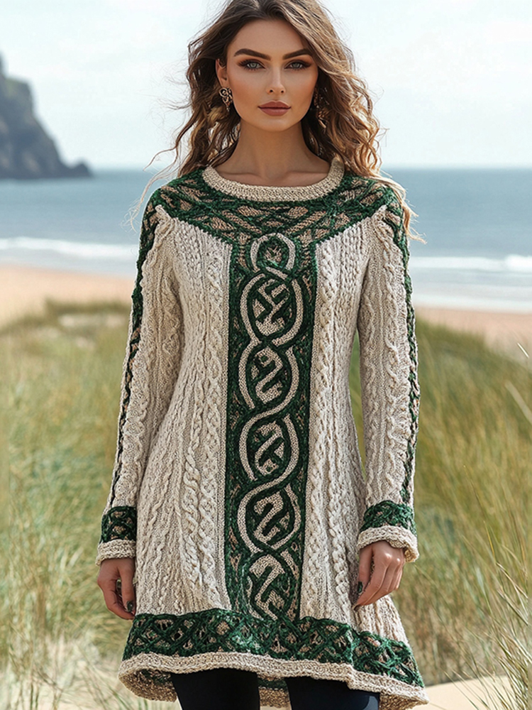 Women's Irish Celtic Knotted Crew Neck Contrast Sweater Dress
