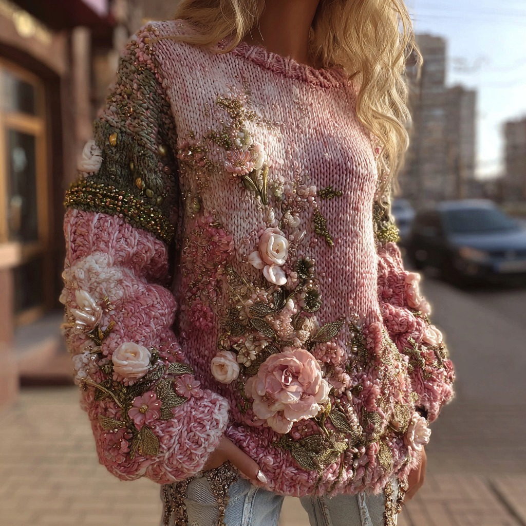 Women's Vintage Rose Embroidery Knitted Crew Neck Sweater