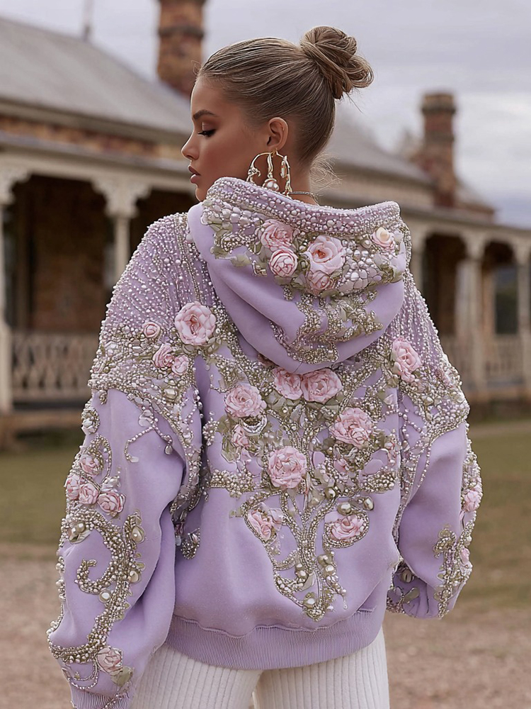 Women's Vintage Rose Pearl Embroidered Comfort Hoodie