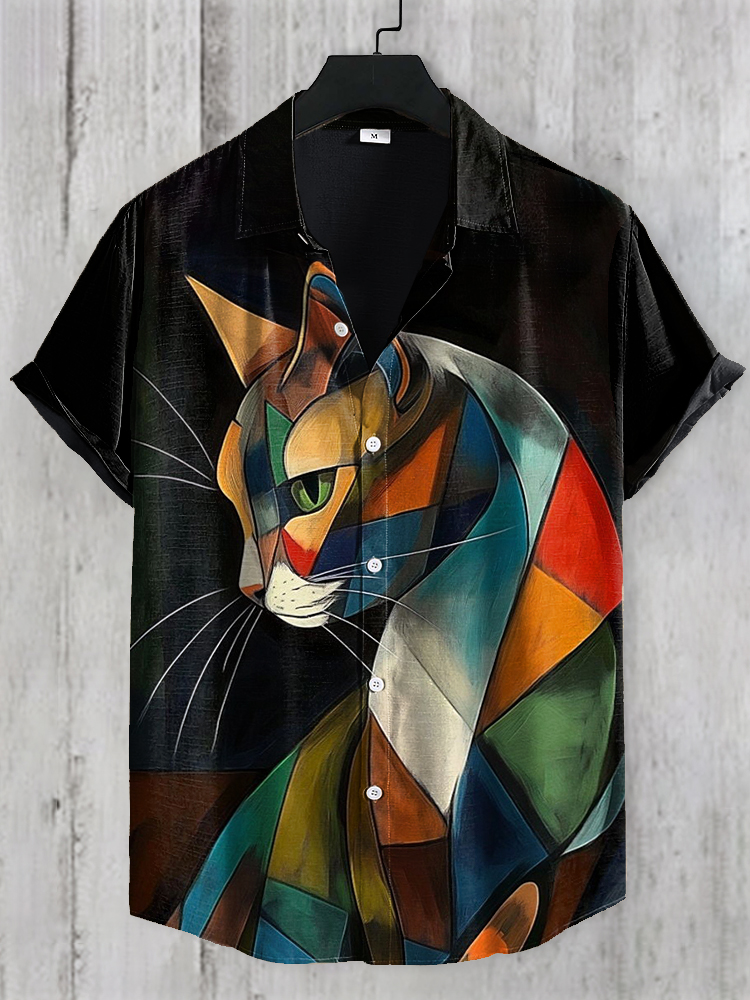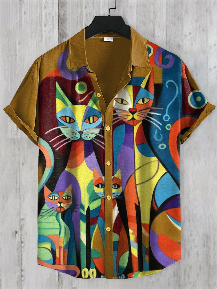 Vintage Japanese Cat Print Men's Linen Short Sleeve Shirt