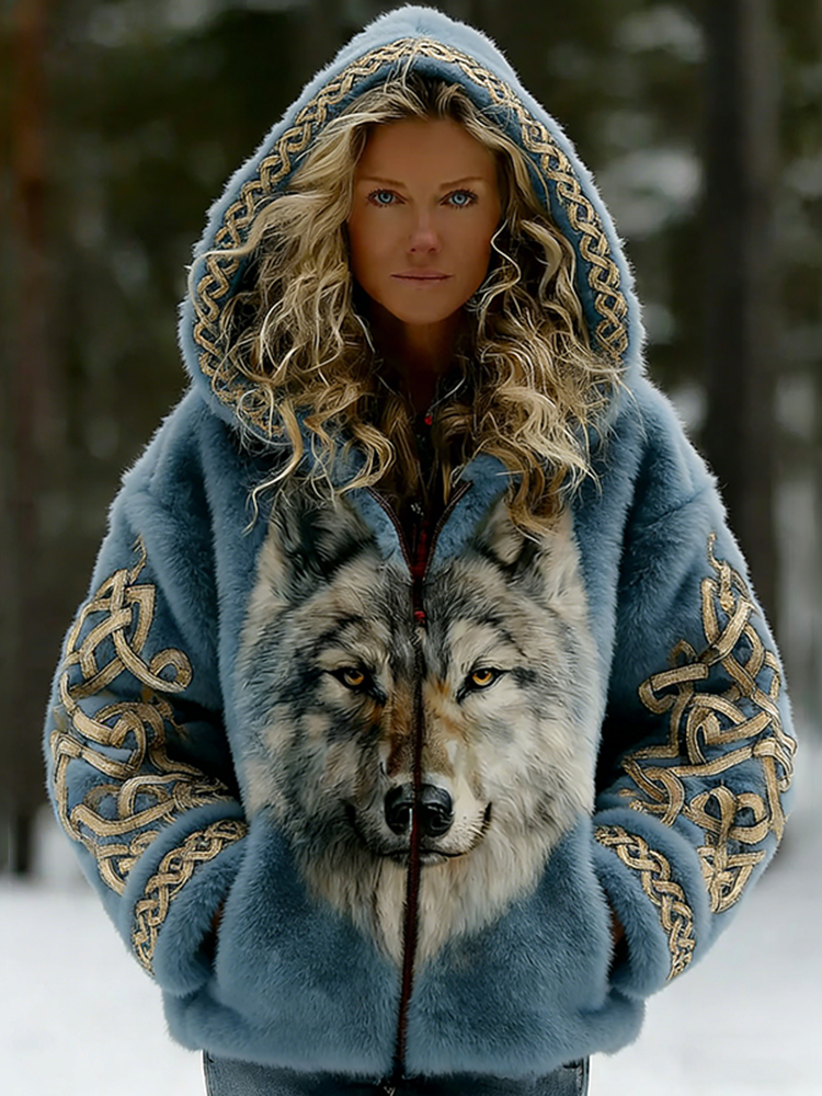 Women's Viking Style Wolf Celtic Art Fleece Hooded Zip-up Jacket