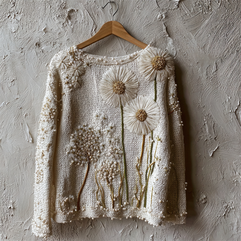 Vintage Forest Dandelion Beaded Embroidered Cozy Knit Sweater