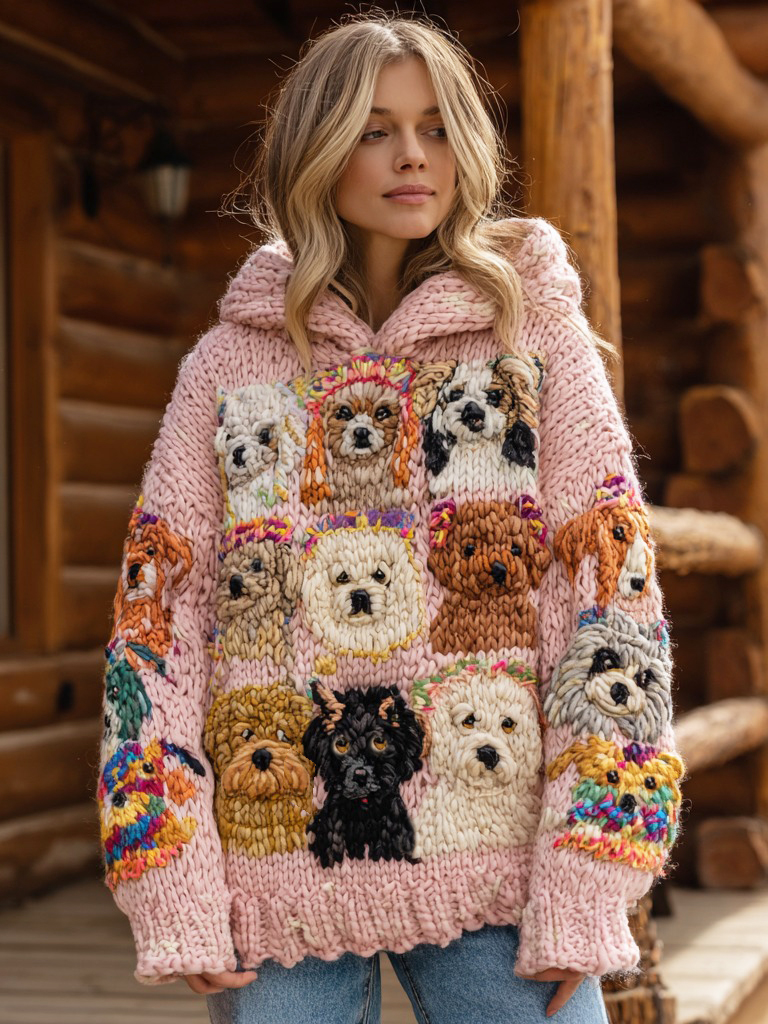 Women's Colorful Puppy Pattern Cozy Chunky Knit Hooded Sweater