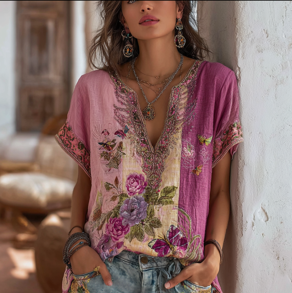 Bohemian Style V-neck Butterfly And Flower Embroidery Cotton And Linen Short Sleeve