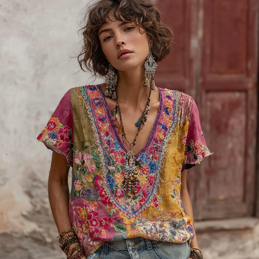 Women's Vintage Bohemian Floral Embroidery Art Patchwork V-neck Linen Blend T-shirt