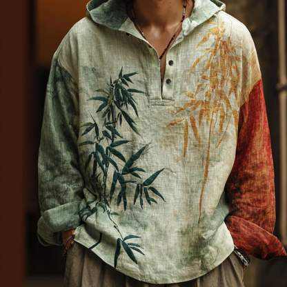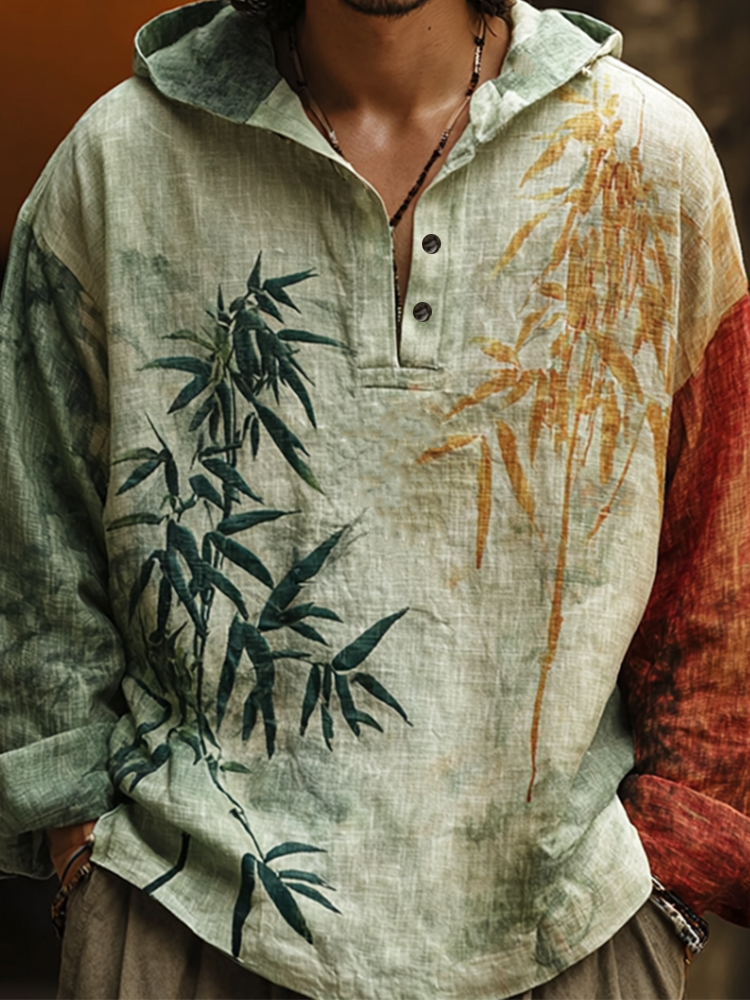 Japanese Art Style Plant Flower Embroidery Men's V-neck Cotton And Linen Hooded Top
