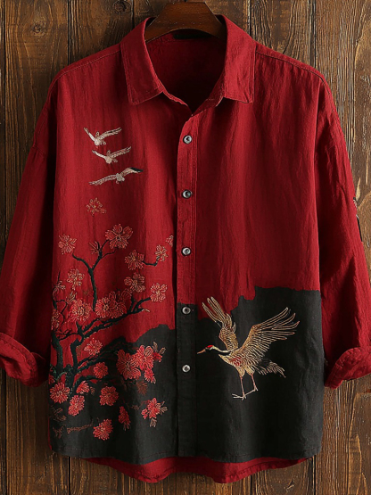 Japanese Cherry Blossom And Crane Art Print Casual Linen Shirt