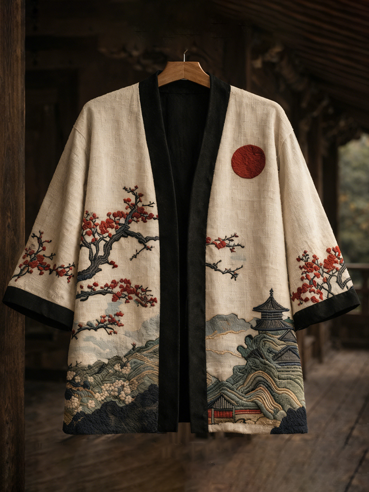Japanese Cherry Blossom Landscape Art Linen Blend Kimono Cardigan