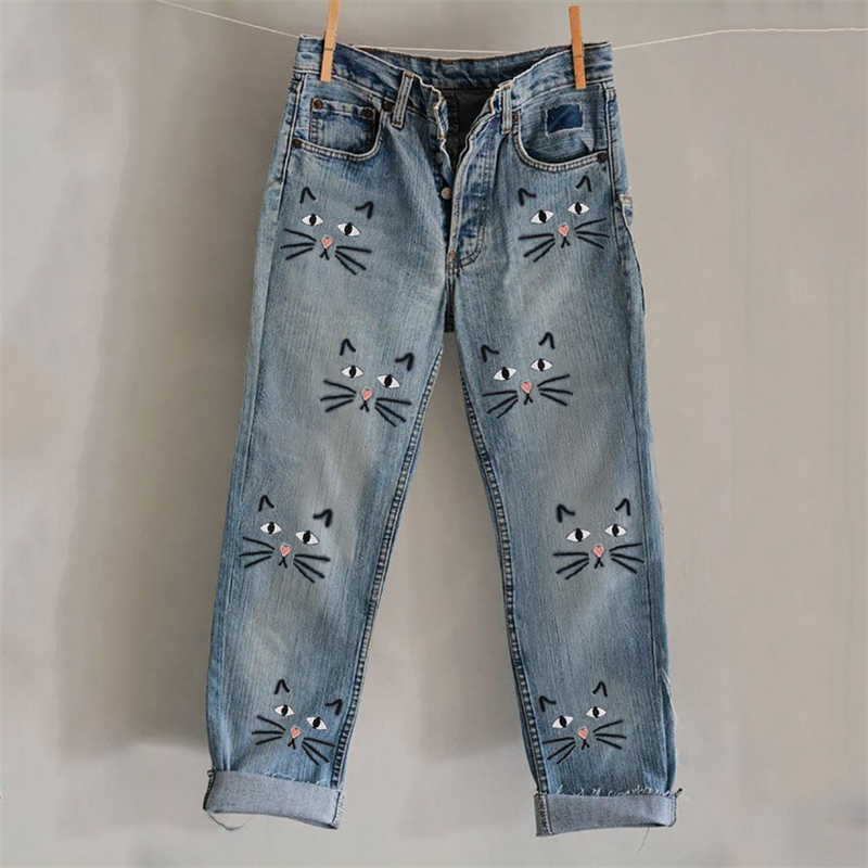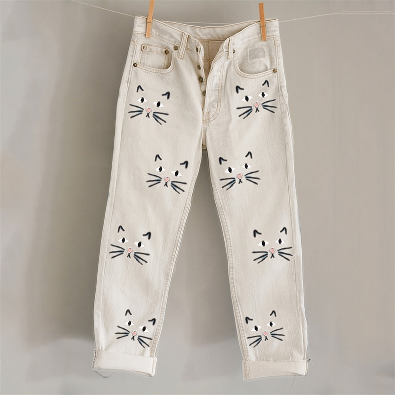 Lovely Cat Faces Embroidery Pattern Washed Jeans