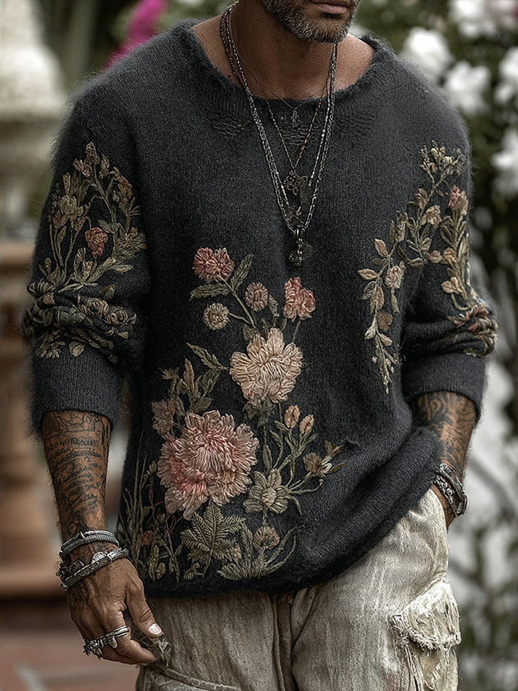 Men's Classic Floral Art Jacquard Thick Warm Round Neck Sweater