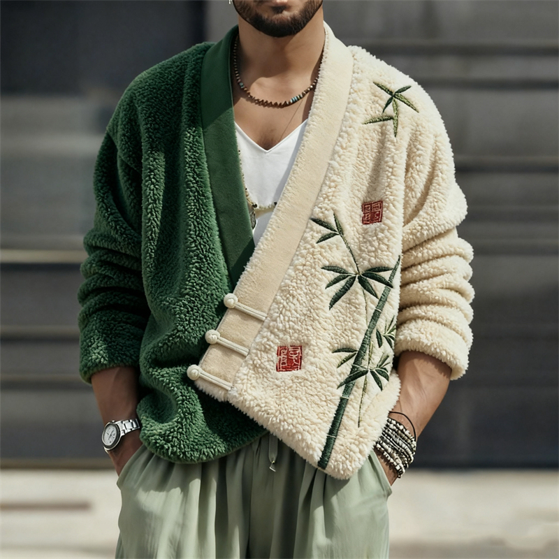 Men's Japanese Bamboo Embroidered Contrast Cozy Fleece Kimono Cardigan