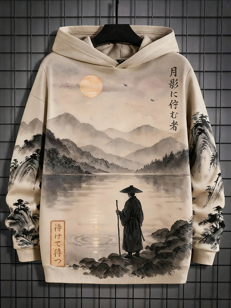 Men's Japanese Landscape Calligraphy Art Print Casual Hoodie