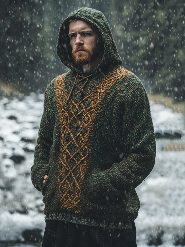 Men's Vintage Irish Celtic Knot Jacquard Mottled Hooded Sweater