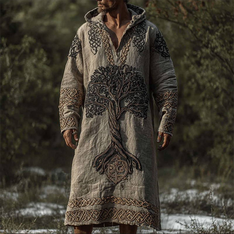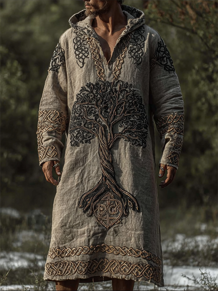 Men's Vintage Viking Tree Of Life Celtic Hooded Linen Long Kaftan