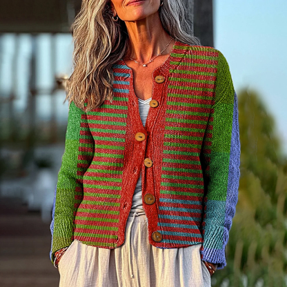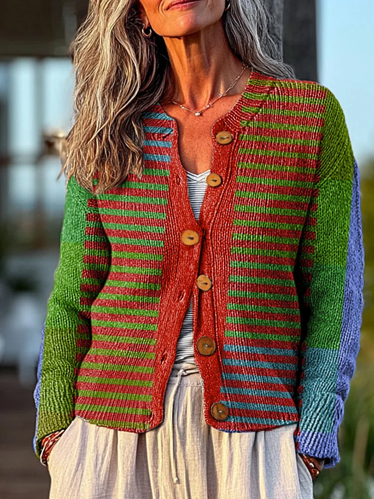 Vintage Geometric Stripe Painting Art Print Buttoned Cardigan Sweater