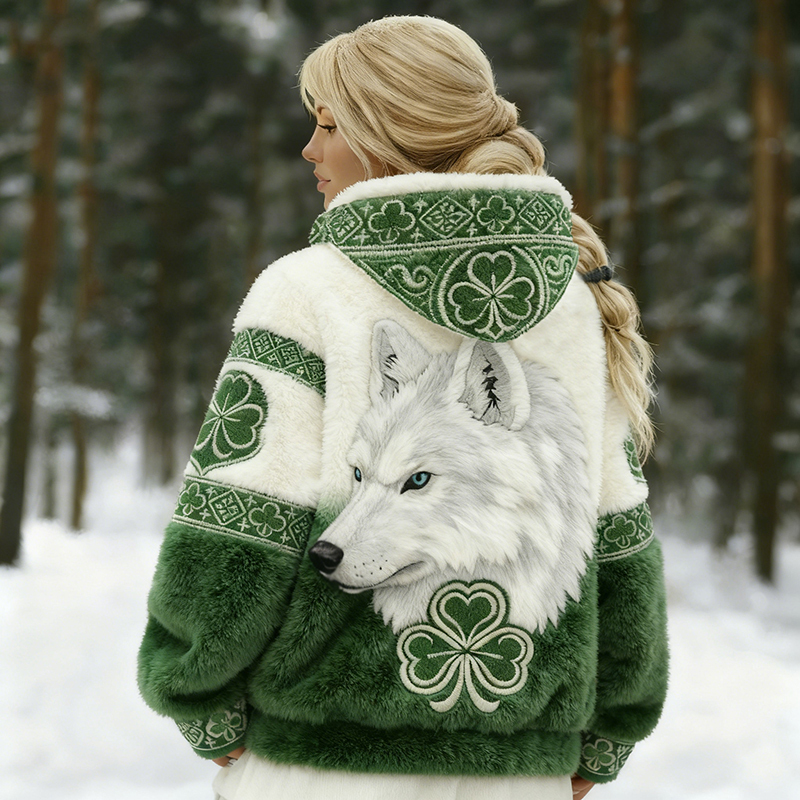Women's St. Patrick's Day Clover With Wolf Print Zipper Flannel Hoodie