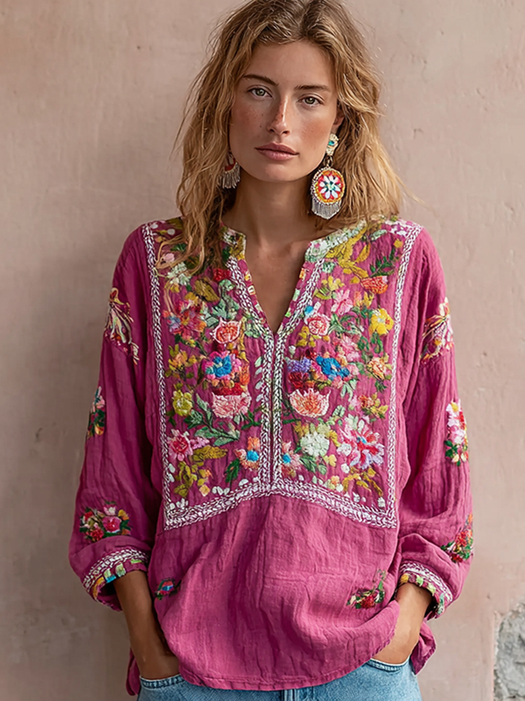 Women's Vintage Flower Embroidery V-neck Long Sleeve Linen Blend Blouse