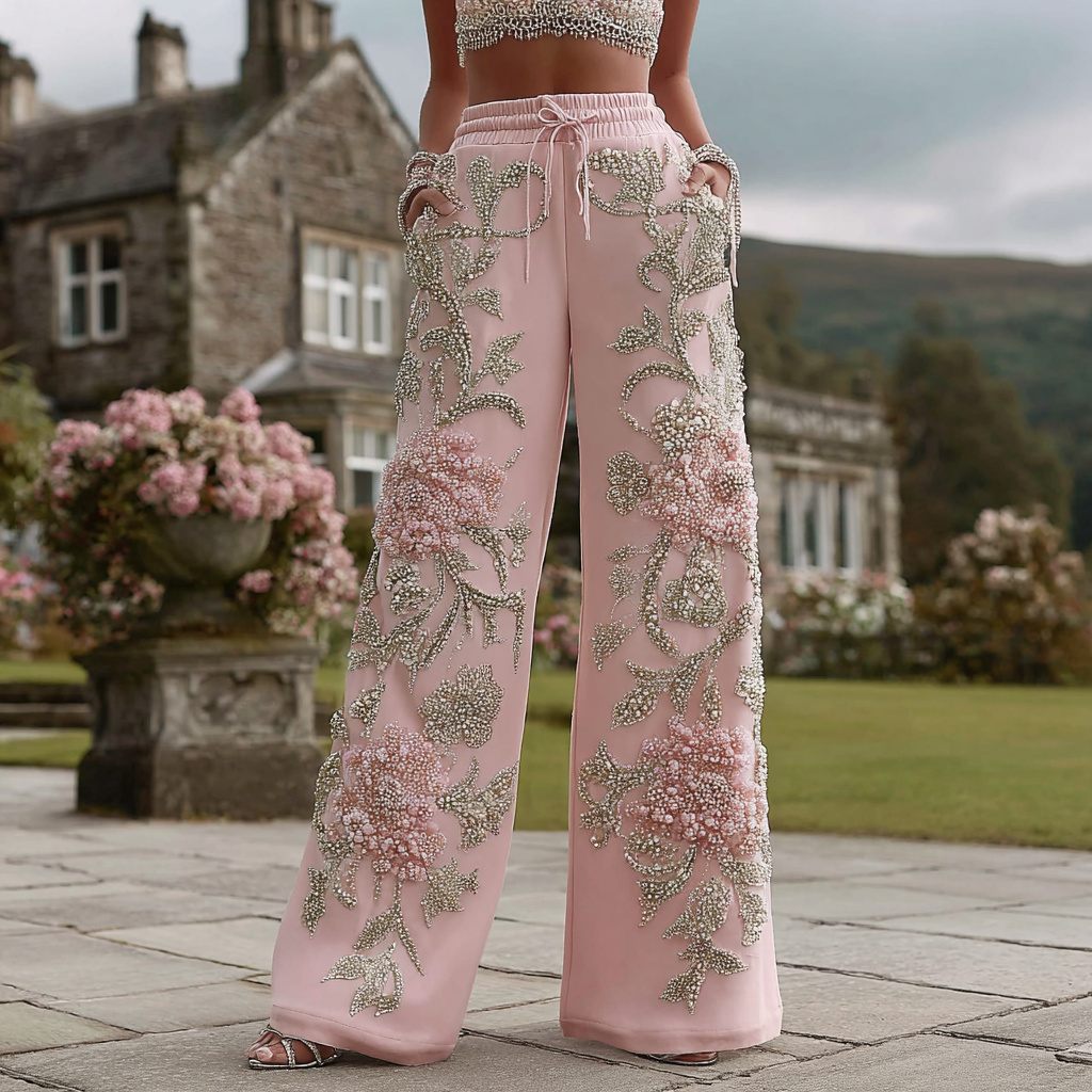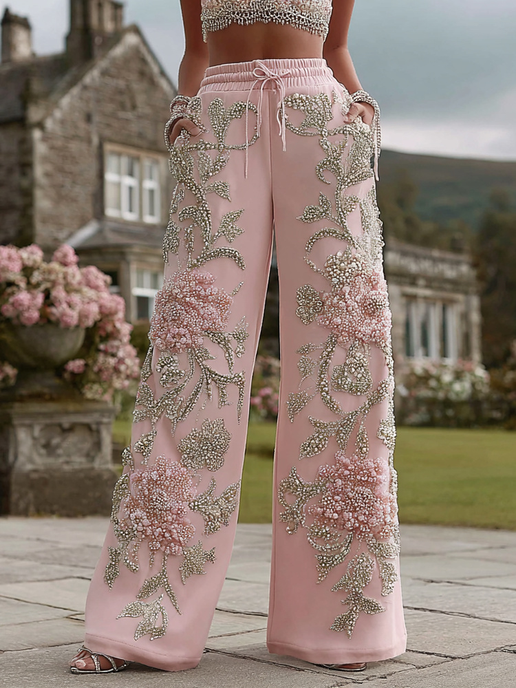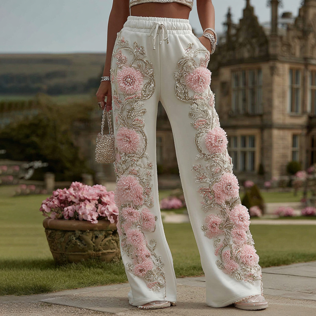 Women's Vintage Pink Floral Embroidery Art Sweatpants