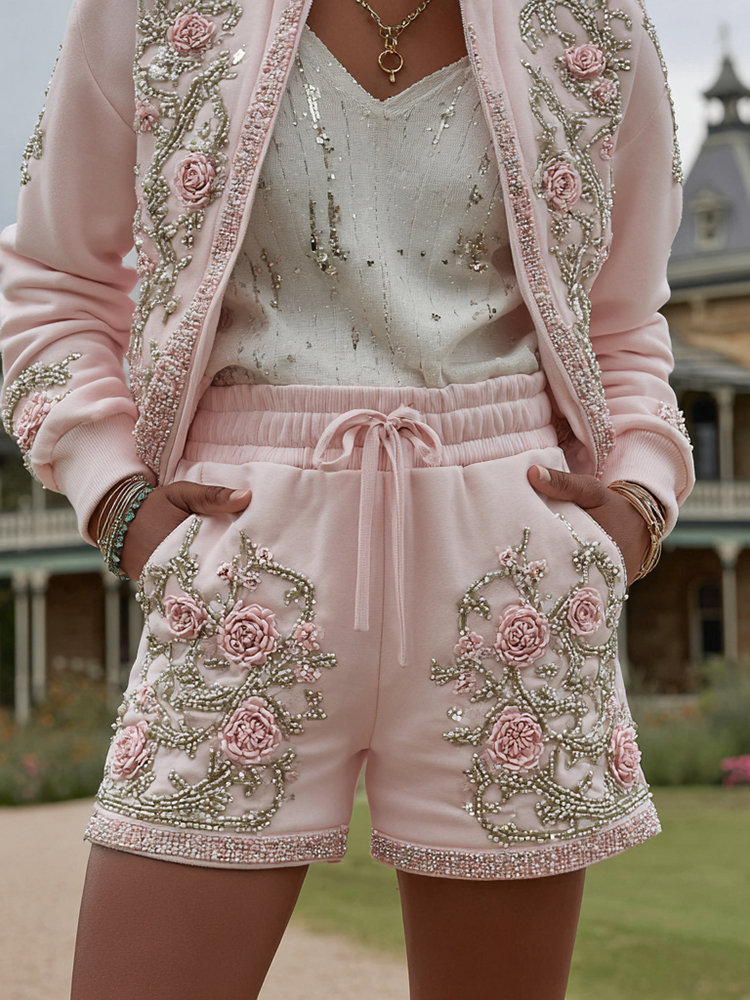 Women's Vintage Pink Floral Embroidery Art Comfort Shorts