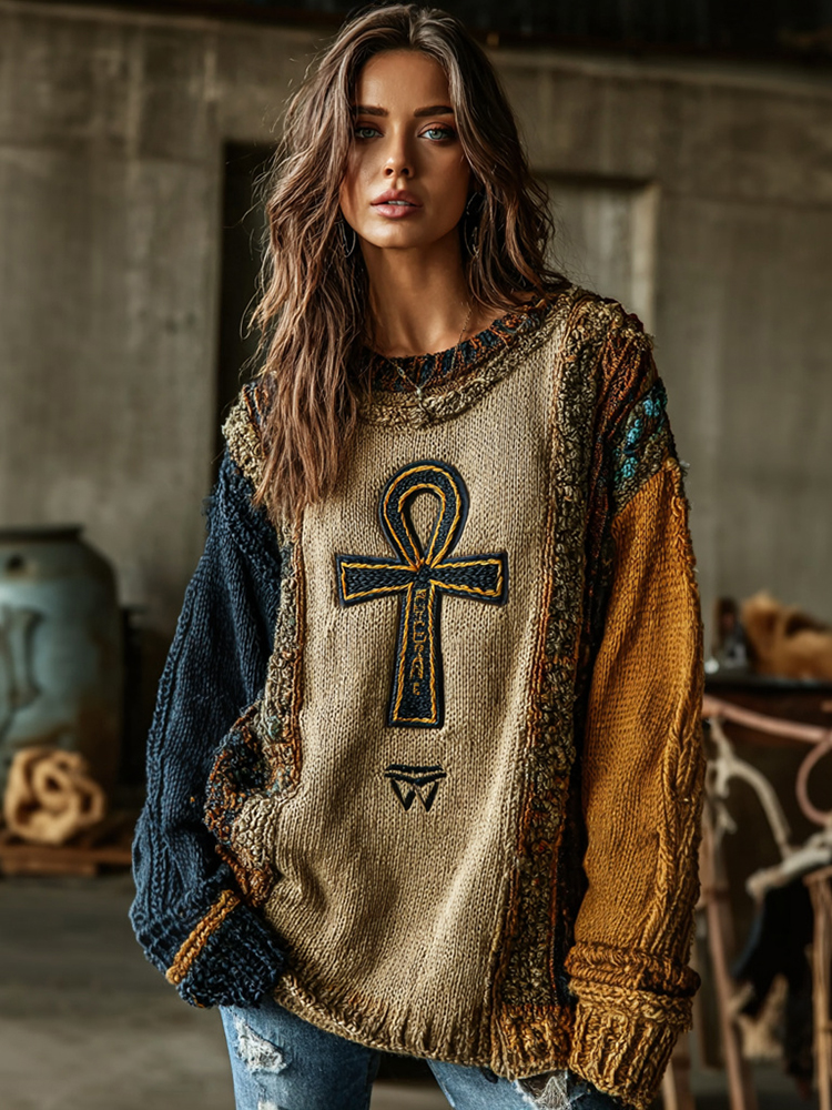 Women's Ancient Egyptian Ankh Pattern Patchwork Knit Pullover Sweater
