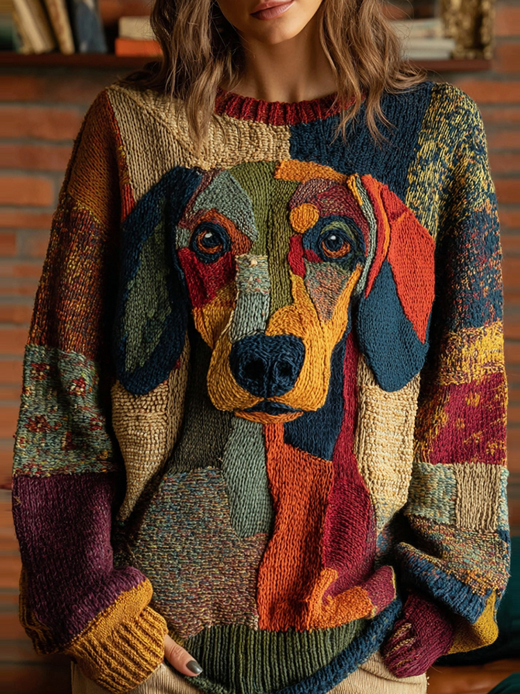 Vintage Classic Patchwork Dachshund Inspired Cozy Knit Sweater