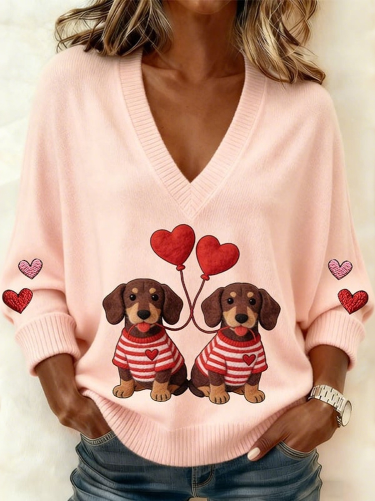Women's Valentine's Day Inspired Dachshund Print V-neck Sweatshirt