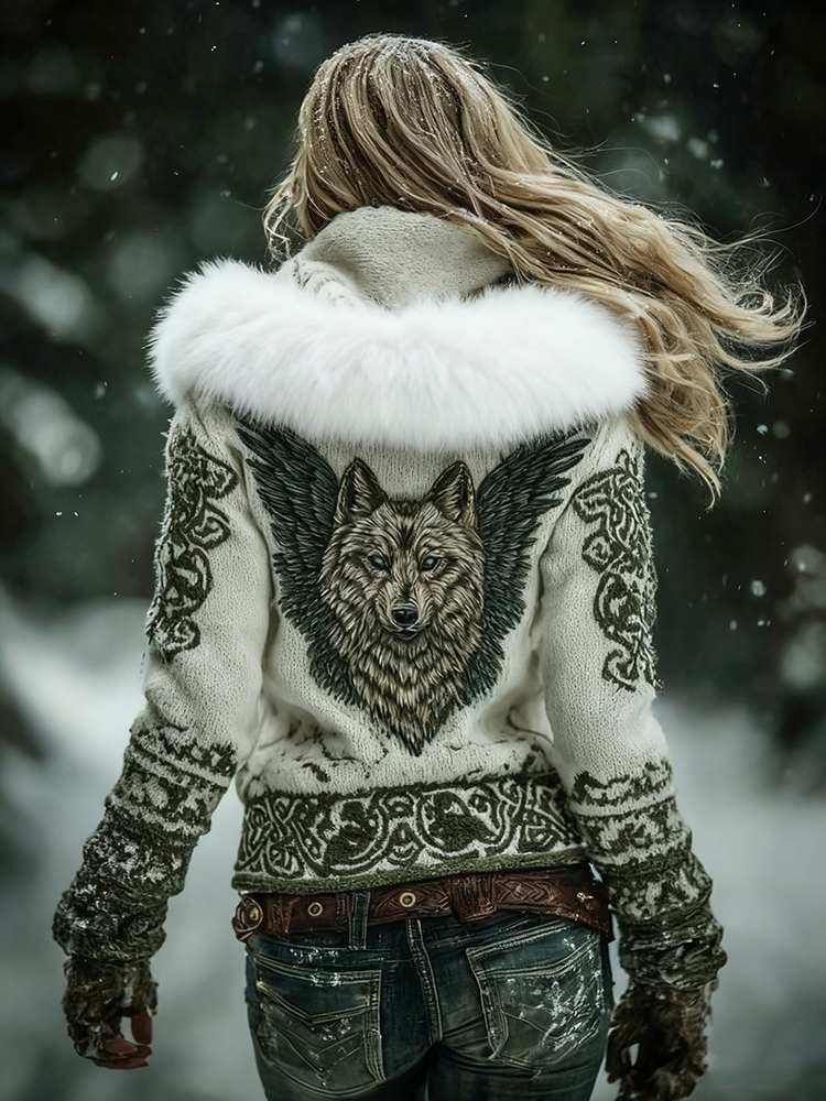 Women's Viking Wolf Art Knit Warm Hooded Sweater