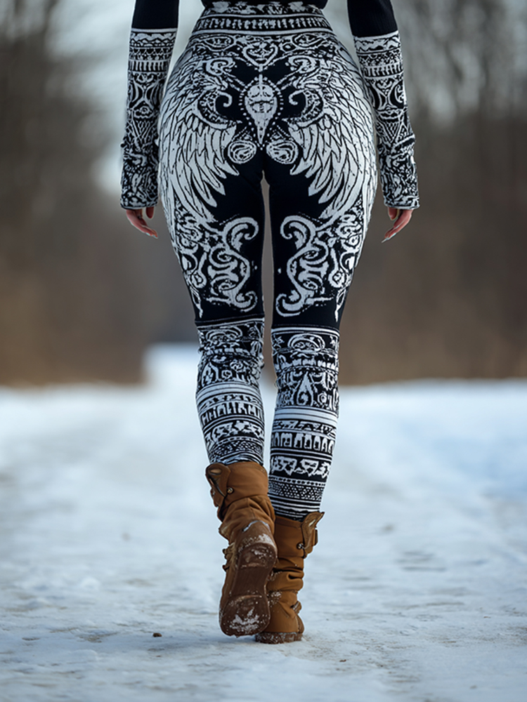 Vintage Viking Inspired Angel Wings Pattern Cozy Knit Leggings