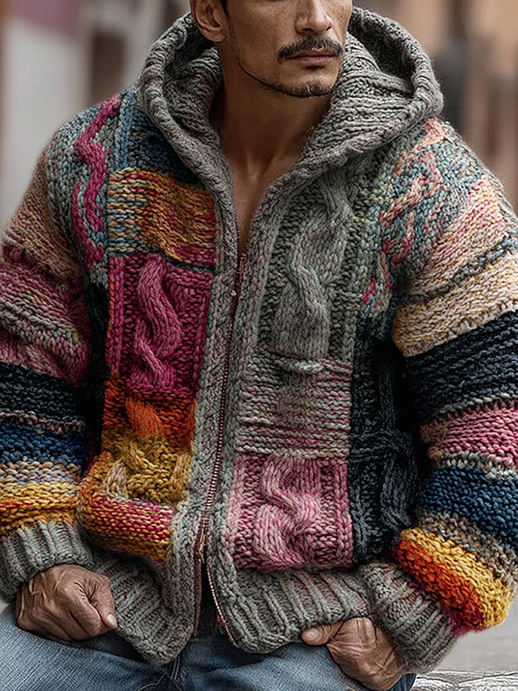 Men's Retro Geometric Knit Jacquard Warm Zip Hooded Sweater