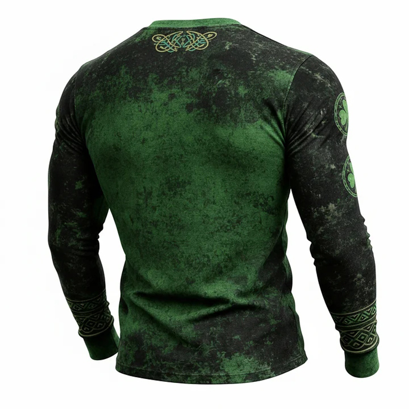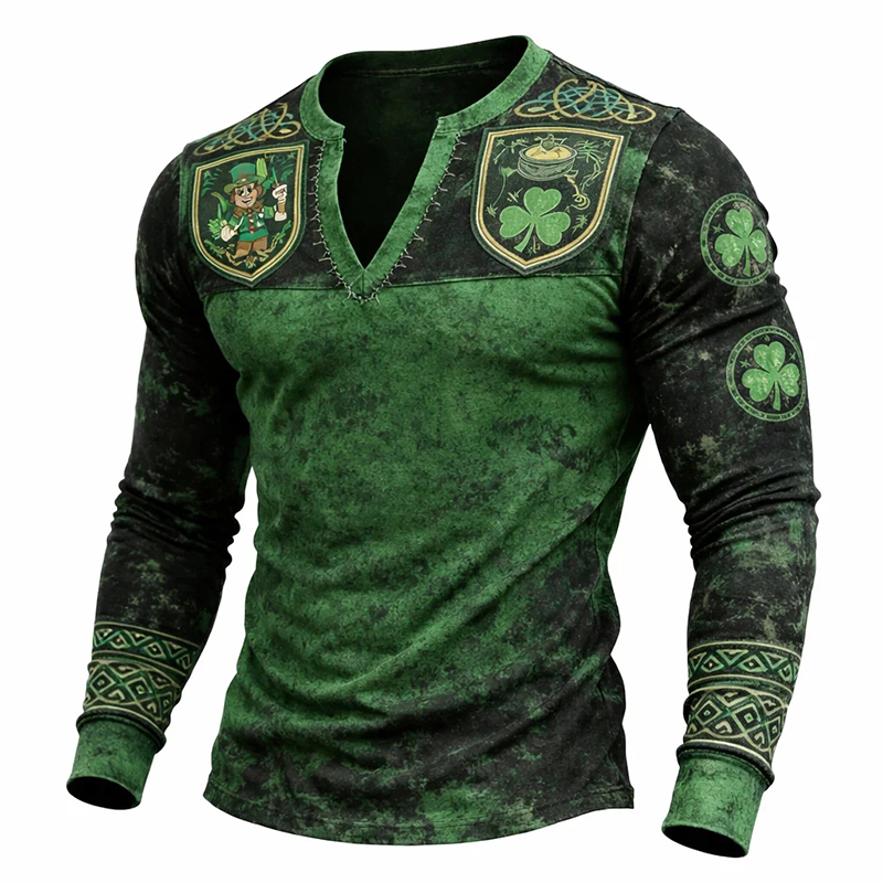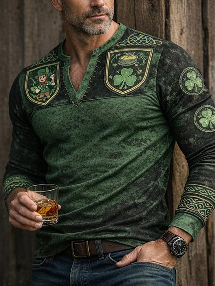 Men's St. Patrick's Day Leprechaun Print Long Sleeve V-neck T-shirt