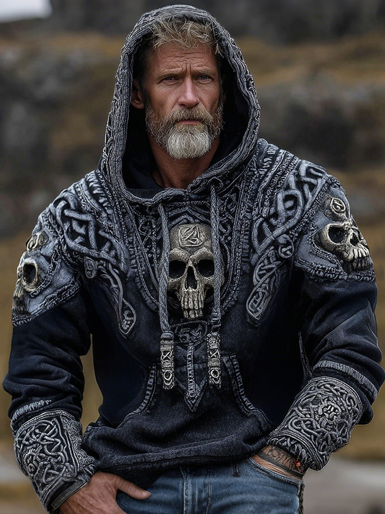 Viking Skull And Celtic Knot Inspired Tribal Distressed Washed Hoodie
