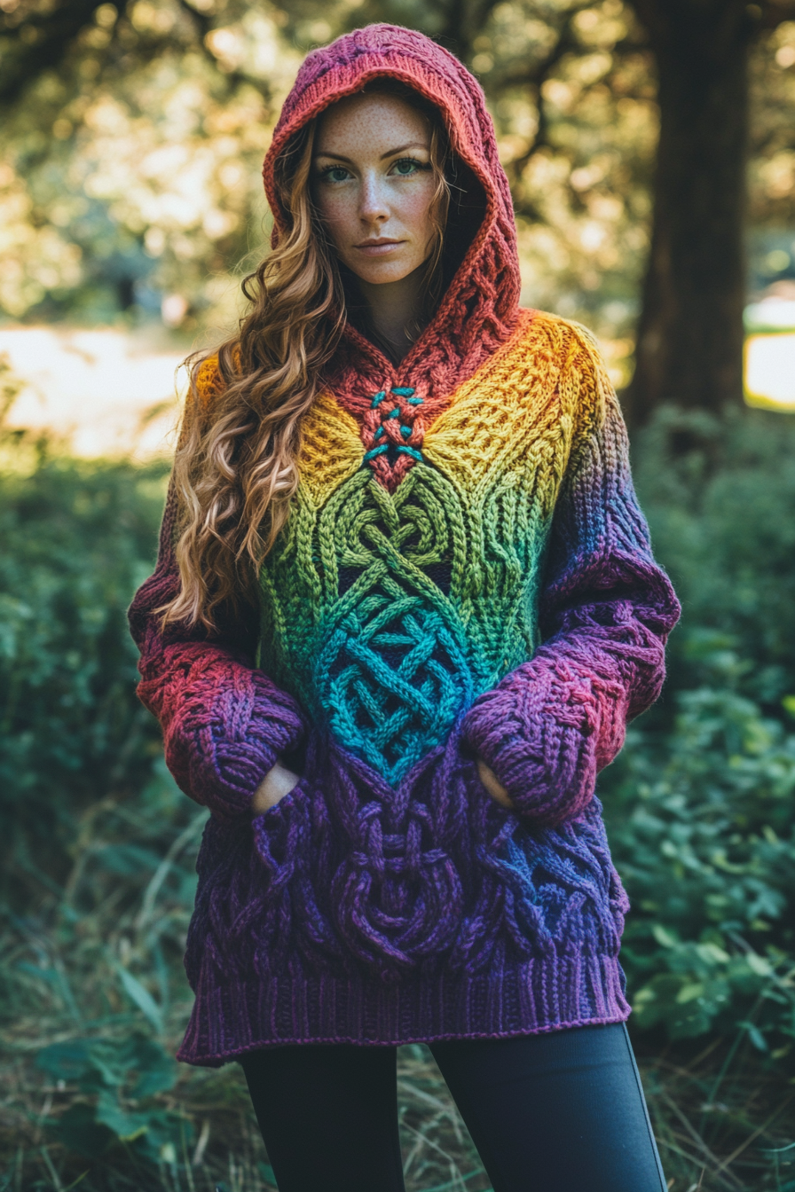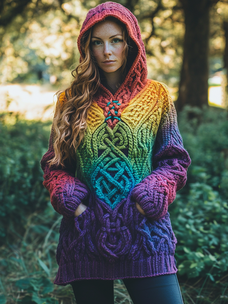 Women's Irish Rainbow Pattern Jacquard Pocket Cozy Hooded Sweater