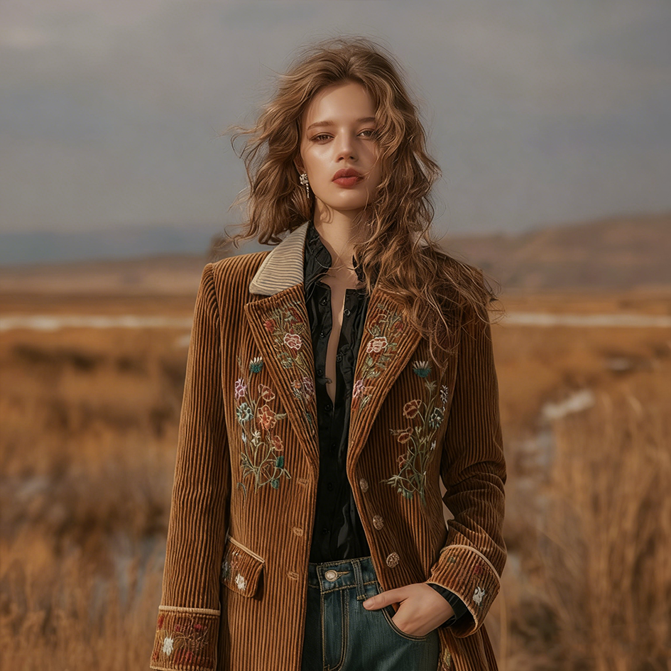 Women's Retro British Style Plant Flower Embroidery Velvet Suit Coat