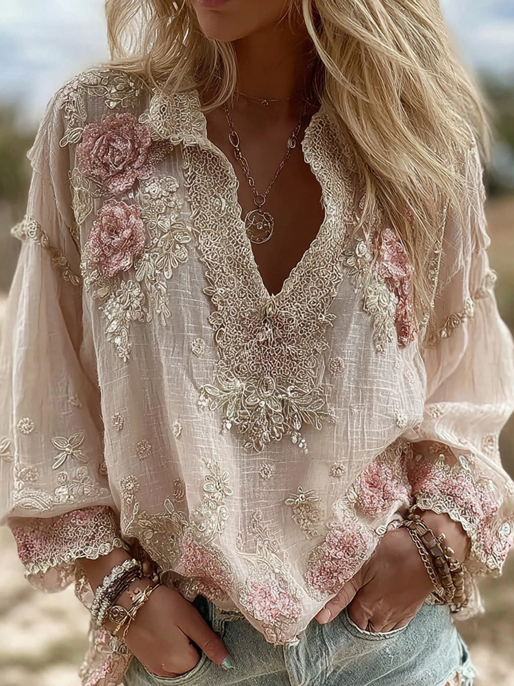 Women's Rose Embroidery Art V-neck Short Sleeve Linen Blend Shirt