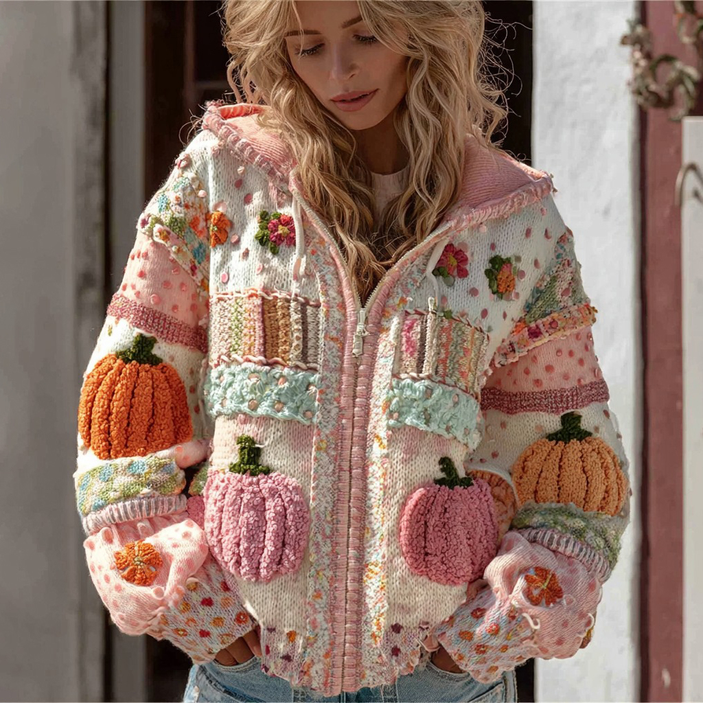 Women's Thanksgiving Pumpkin Knit Colorblock Cozy Zip Hooded Sweater