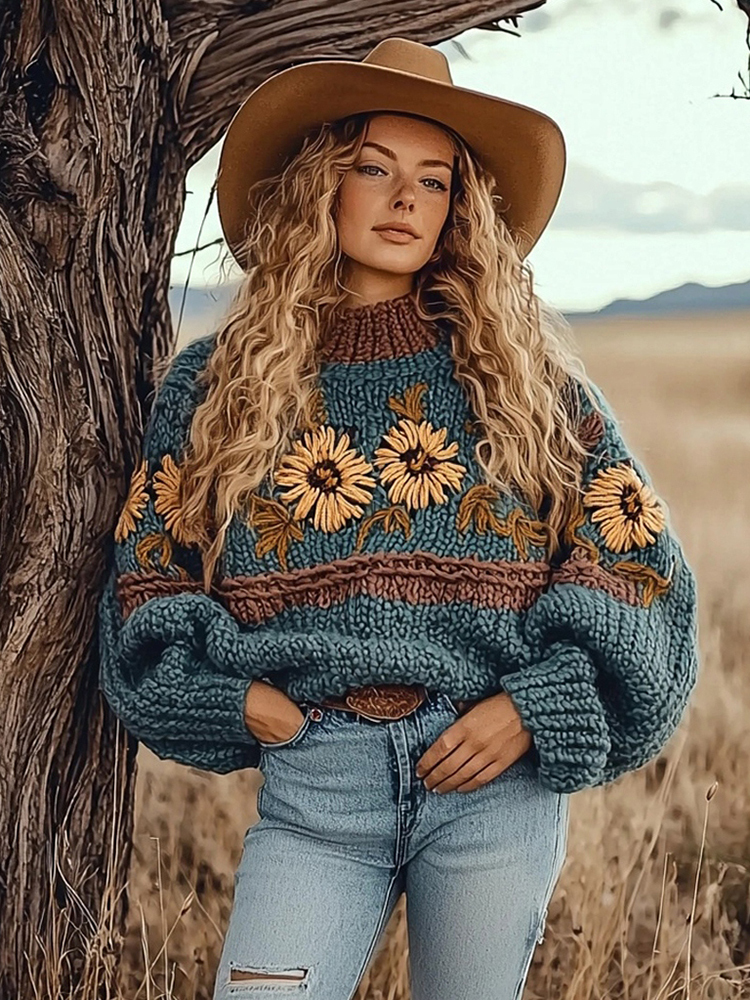 Women's Western Vintage Sunflower Floral Cozy Sweater